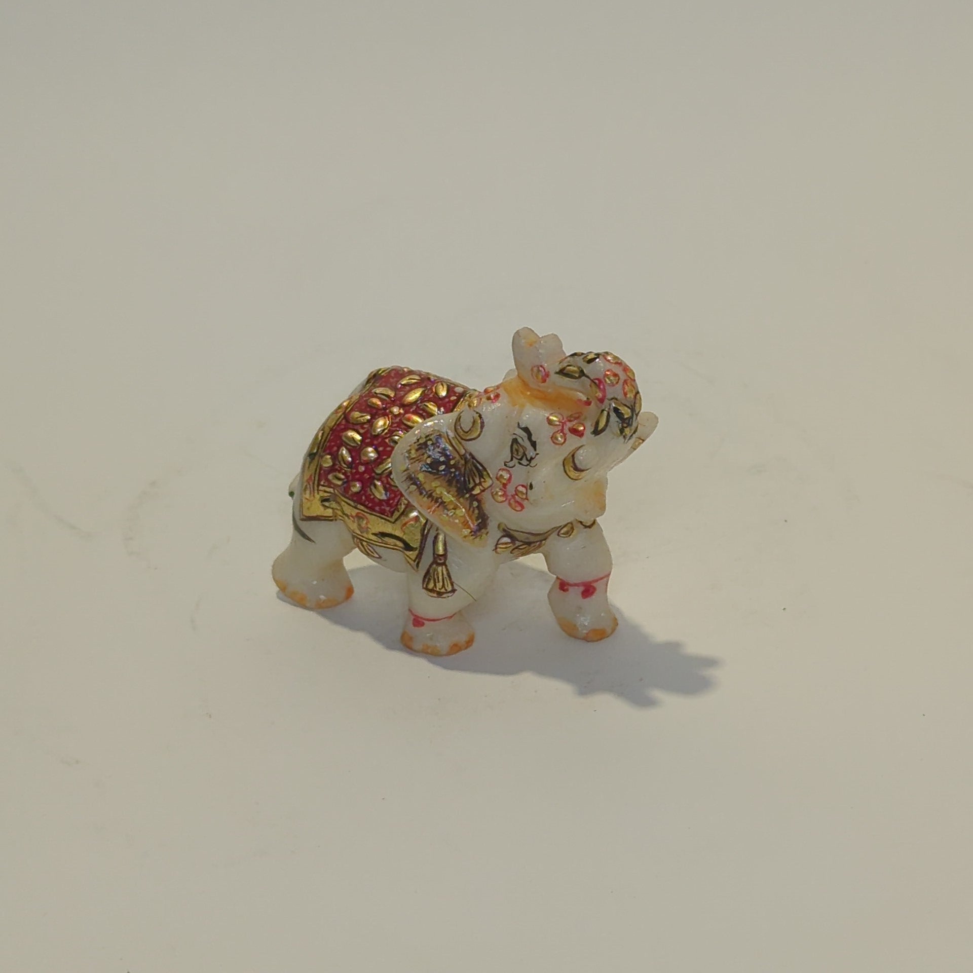 Handbemalter Marmor-Elefant aus indischem Kunsthandwerk. Jedes Stück ist ein Unikat, gefertigt aus echtem Marmor mit feinen Details in leuchtenden Farben. Maße: ca. 6 x 6 x 4 cm. Ein elegantes Dekostück und symbolischer Glücksbringer für Wohn- oder Arbeitsräume.