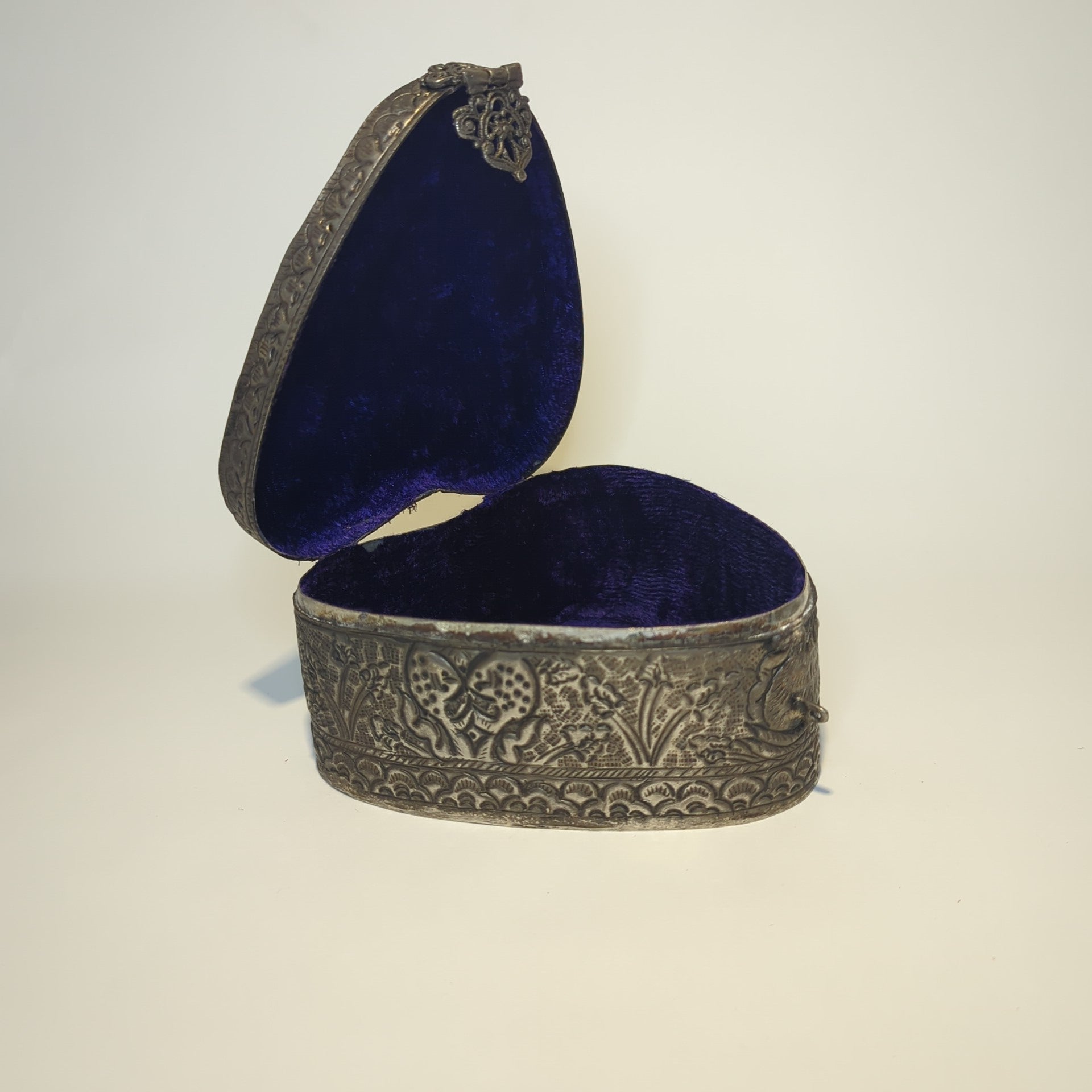 Herzförmige Weißmetall Dose gehämmert – Innen blauer Samt – Handarbeit aus Indien