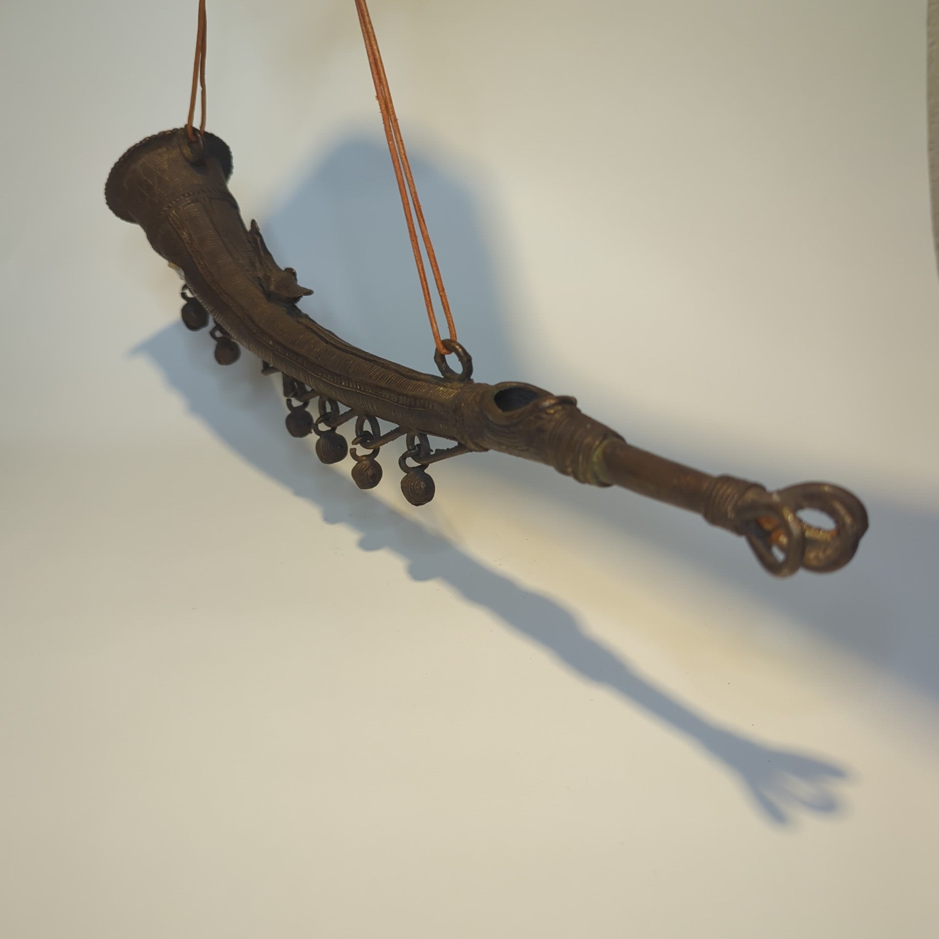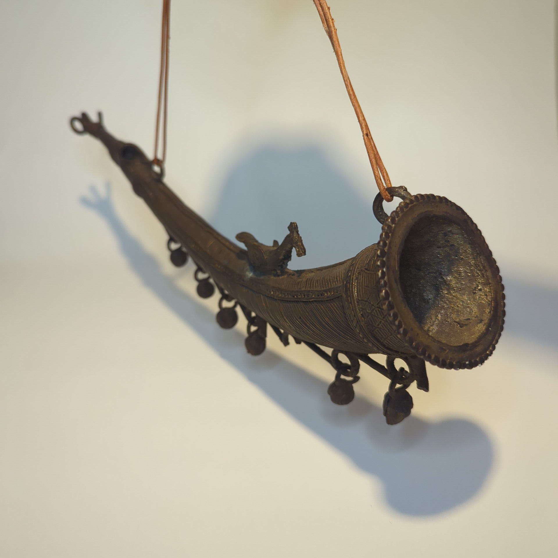Handgeschmiedetes Blashorn aus massivem Messing mit kunstvoll gearbeiteter Pfauenfigur. Dieses traditionelle indische Jagdhorn besticht durch seine orientalische Ästhetik und dient primär als dekoratives Kunstobjekt. Mit 40 cm Länge und klassischem Vintage-Charakter eignet es sich hervorragend als Wandschmuck oder Sammlerstück für Liebhaber außergewöhnlicher Handwerksstücke.