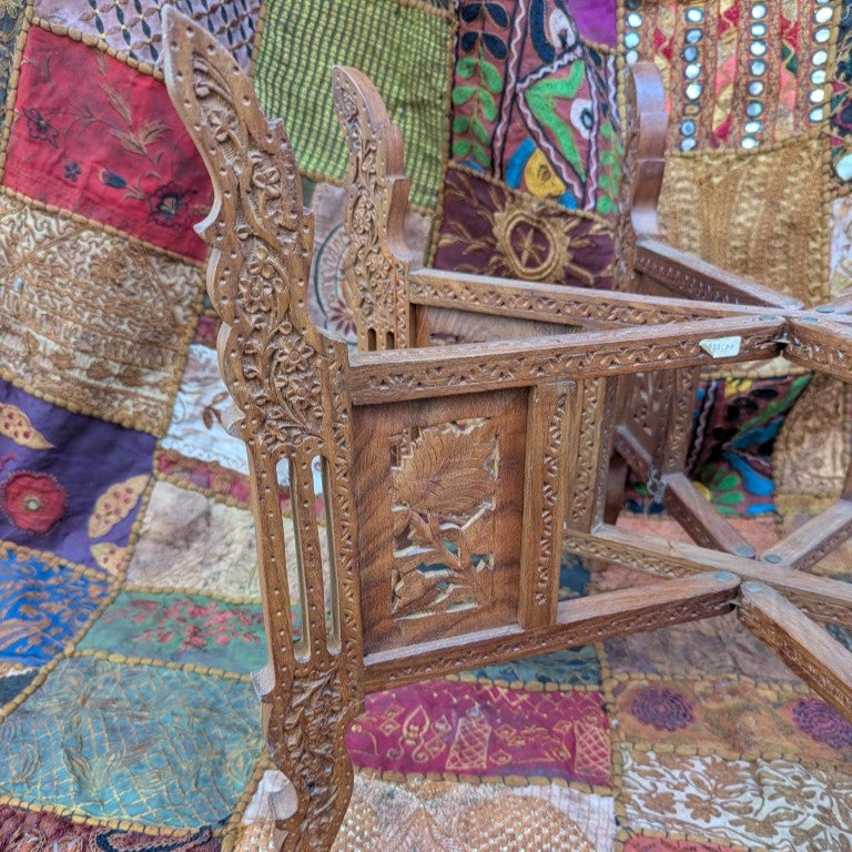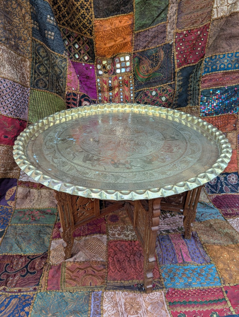 Diese einzigartige Artikelbezeichnung lädt dazu ein, Ihrem Zuhause einen exotischen Touch zu verleihen. Das Herzstück ist eine handgeschlagene Messingplatte mit einem detailreichen Elefanten- und Blumenmotiv. Diese kunstvolle Platte ruht auf einem stabilen, handgeschnitzten Teakholzgestell. Ein besonderes Detail, das jeden Blick auf sich zieht, ist das durchgängige florale Design, das sich auf allen Seiten des Gestells befindet. Holen Sie sich noch heute dieses einzigartige Ensemble aus Messingplatte und geschnitztem Holz und bereichern Sie Ihr Interieur!